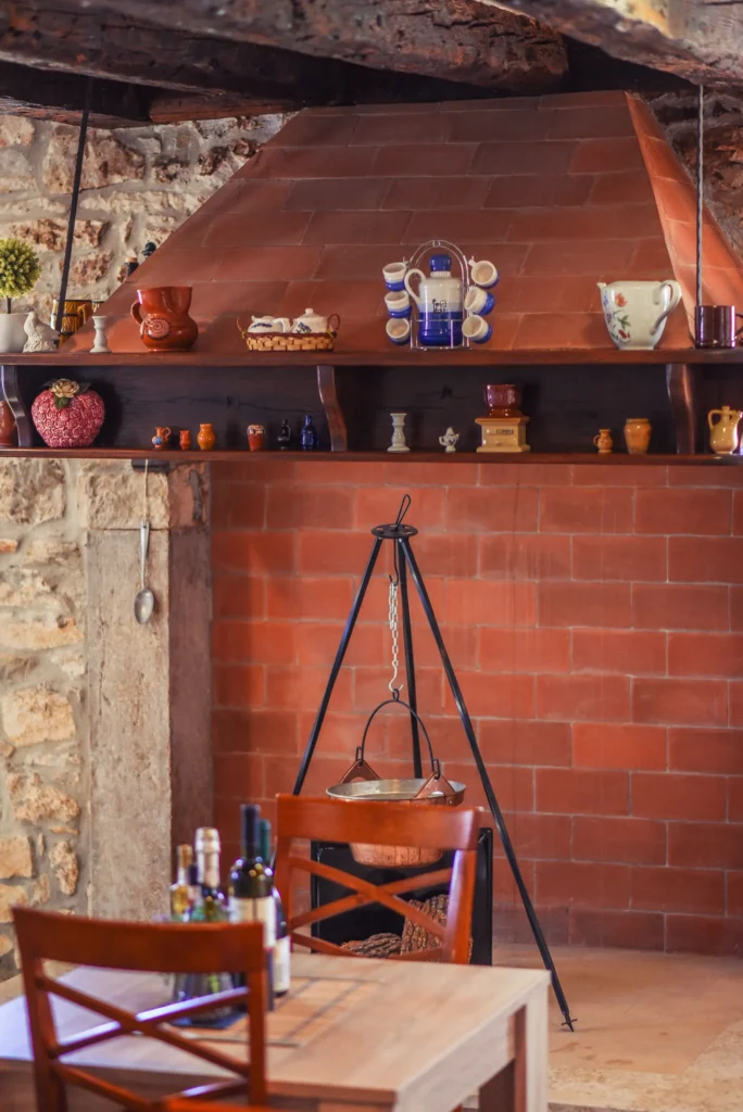 Our charming kitchen and dining area combines rustic style with modern convenience. The fully equipped kitchen features a refrigerator, stove, oven, dishwasher, and all essential kitchen accessories. Wooden beams and an indoor fireplace add to the rustic charm, hinting at the room’s historical use by the Gulich family.